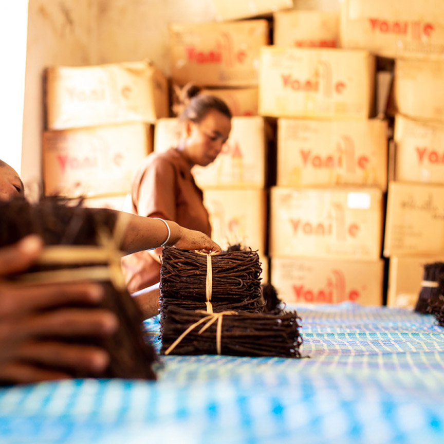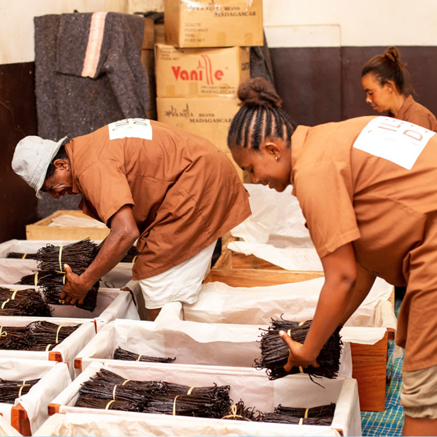 We work closely with farmers from various vanilla-producing regions of Madagascar. Each vanilla vine is planted using environmentally friendly methods. To preserve the soil and ensure sustainable cultivation, no pesticides are used. Every vanilla bean is carefully harvested and traditionally processed to preserve its full flavor and aroma.